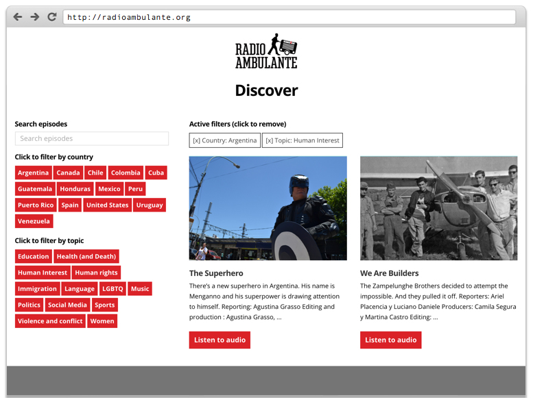 I worked with Design Technologist David Robert Leonard to implement improvements to the design and user experience for the Radio Ambulante listeners. We followed the Lean methodology by making sure we prototyped the minimum set of features. We also followed the principles of User-Centered Design, ensuring that we find out what needs and desires drove the audience before trying to force a solution.