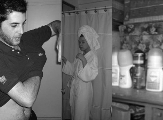 From left to right: Luciano using the deodorant in the bedroom, Ines ready to use it in the bathroom, collection of deodorants that are used for different situations and in different seasons.